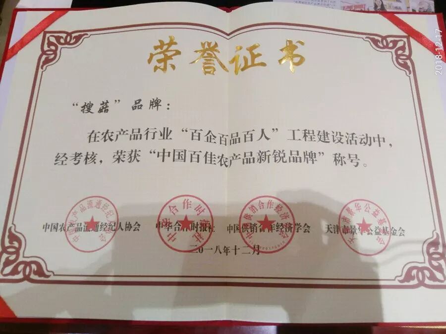 金珠满江旗下品牌“搜菇”荣获“百佳农产品新锐品牌”荣誉。“百企百品百人”建设工程由中国农产品流通经纪人协会联合中华合作时报社、中国供销合作经济学会、天津市景华公益基金会,共同打造的一批有规模、有影响、有持续供应能力的龙农产品行业头企业;一批有品牌、高品质、有竞争力、安全放心的品牌农产品、食品;一批懂农业、爱农村、爱农民,具有国际视野、掌握现代管理、具备市场带动能力、代表行业形象的领军人才。旨在推进农产品产业发展由增产导向转向提质导向,引领消费升级。