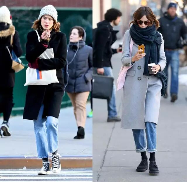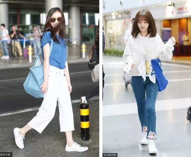 倪妮蓝T恤配白色阔腿裤和小白鞋,肩背蓝色牛仔帆布包,这一身配色真是清新怡人。鞠婧祎白色卫衣搭不规则牛仔裤,小白鞋配挎包清纯似女学生。
