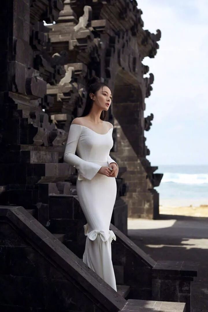 这是一条紧身的白色长裙,张馨予穿起来之后非常的显身材了,裙子下半身有一个蝴蝶结的设计,给衣服增添的一点特色