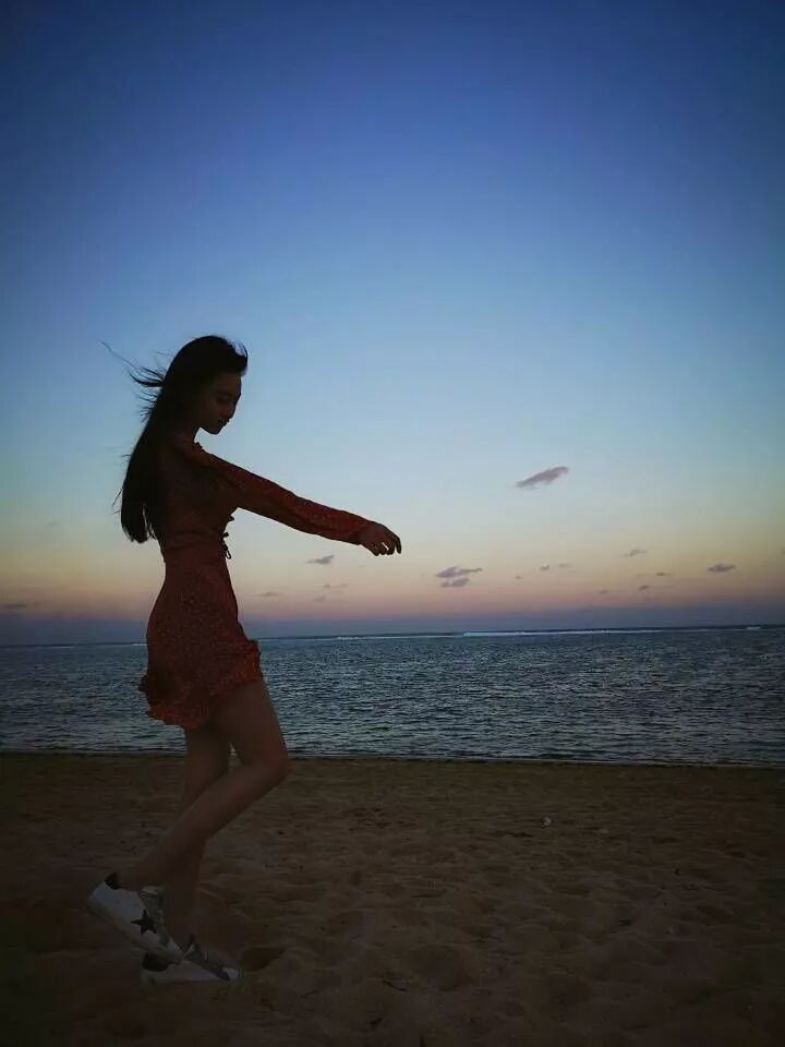 粉色波点的裙子特别的少女,而且裙子有点短又会显得特别的性感,站在夕阳旁边真的是感觉和景色融为一体了呢。