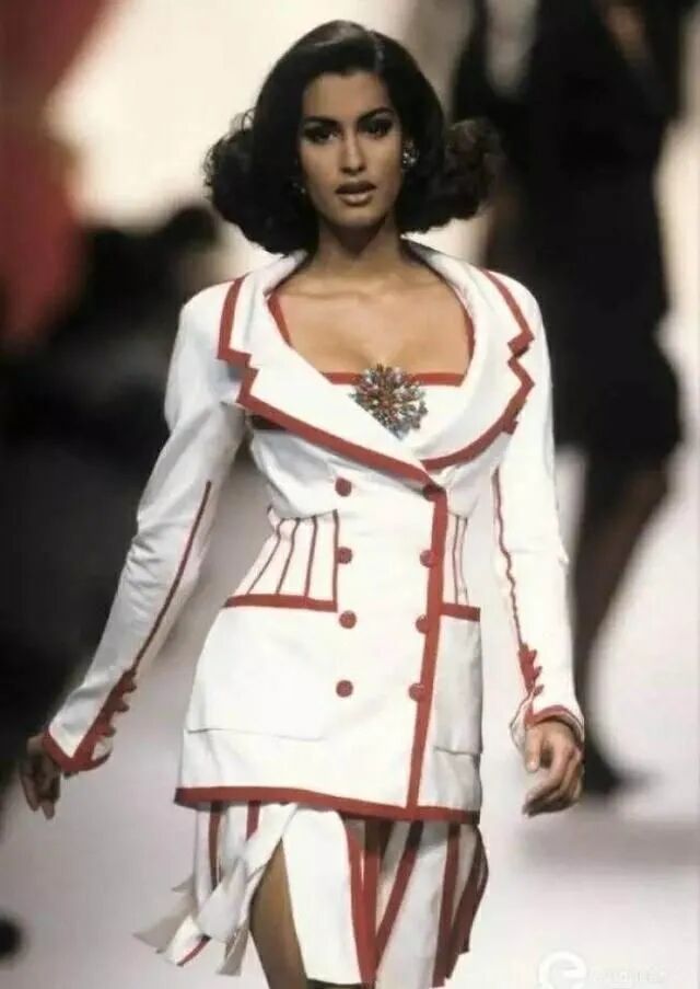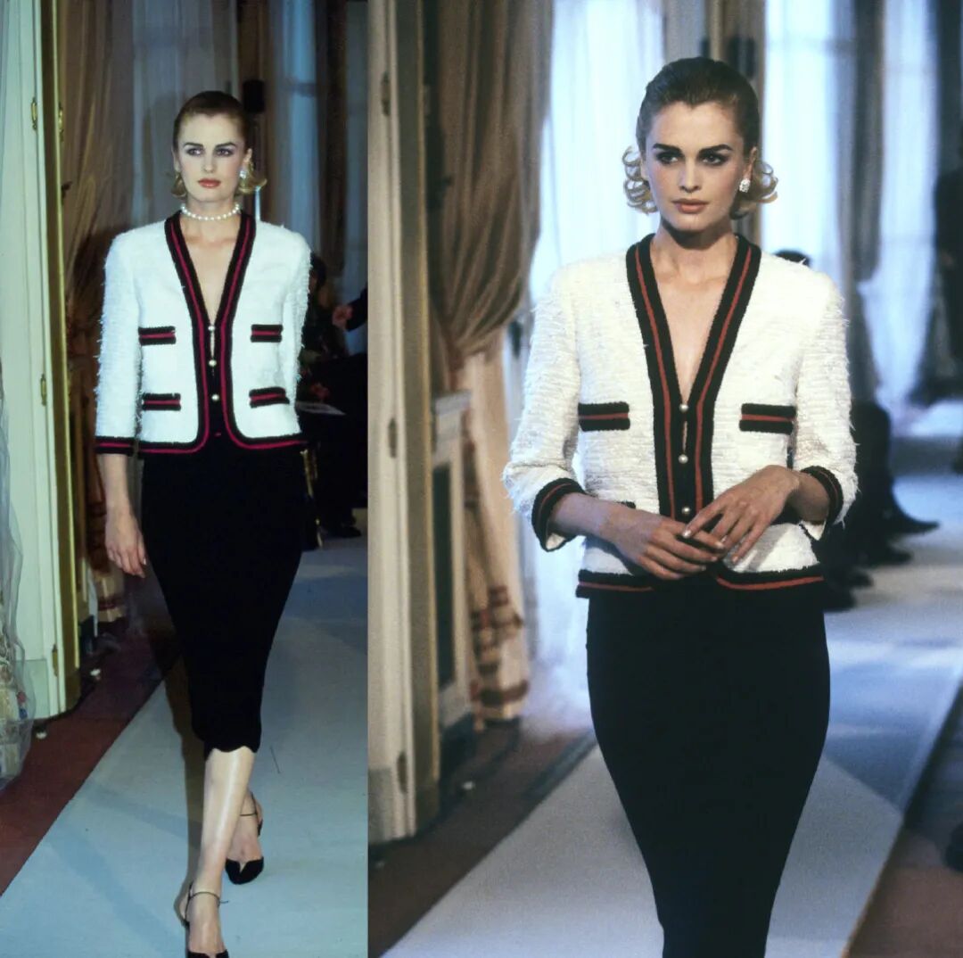 这款!设计不是当时流行的西装,也不是宽松韩版款式,设计收腰修身突出曲线,宽大的领口露出锁骨和脖子,提高露肤度。搭配包臀半身裙露出长腿,陈法蓉在这部剧中最爱的就是这两套,大气端庄又不失妩媚性感。