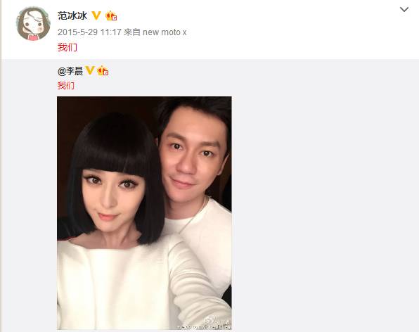 2015年5月29日,李晨在微博上发出了”我们”并附上两个人的合照,随后范冰冰转发了该微博,公开证实与李晨的恋爱关系。根据范冰冰所述,这可是她出道18年来第一次公开恋情!