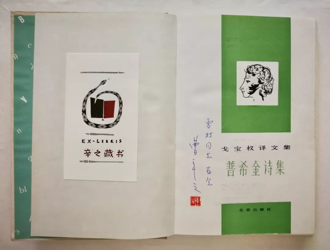 曹辛之先生为戈宝权翻译的《普希金诗集》(北京出版社1987年初版)设计的封面,扉页贴有他的藏书票。