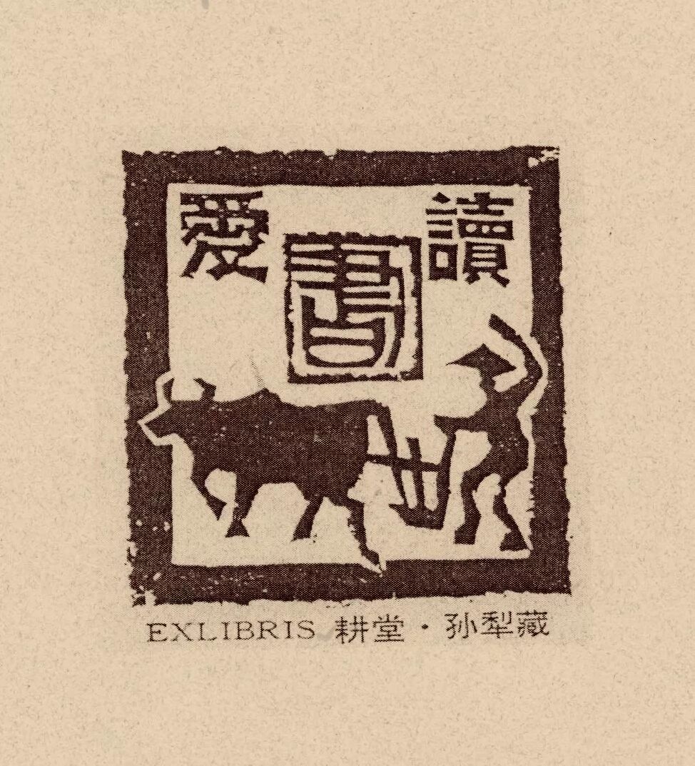 这枚藏书票刻制于1994年,取汉代画像砖“牛耕图”的纹样,觉得那个农夫扶犁耕地的形象,与我见过的孙犁先生和他书房“耕堂”其形其意贴切吻合。