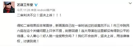 二后来审结果,判决结果推翻了一审判决,新画面公司只需支付张艺谋方面246.36万元,而非一审判决里的1500万元。张艺谋工作室对此发微博表示:二审判决不公!坚决上诉!