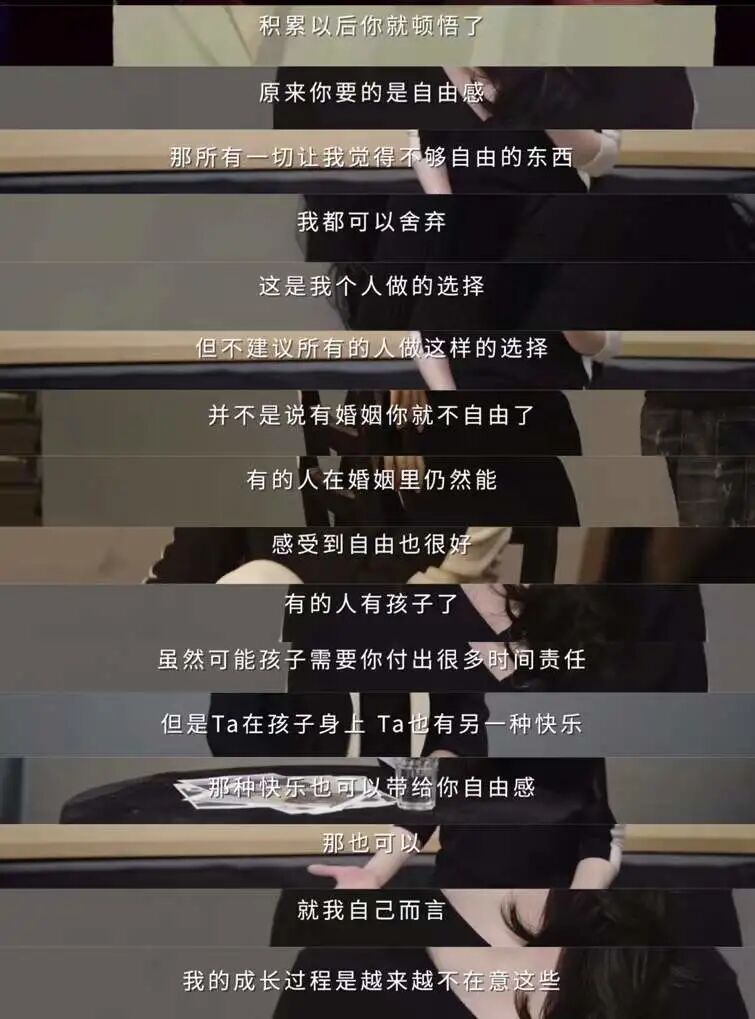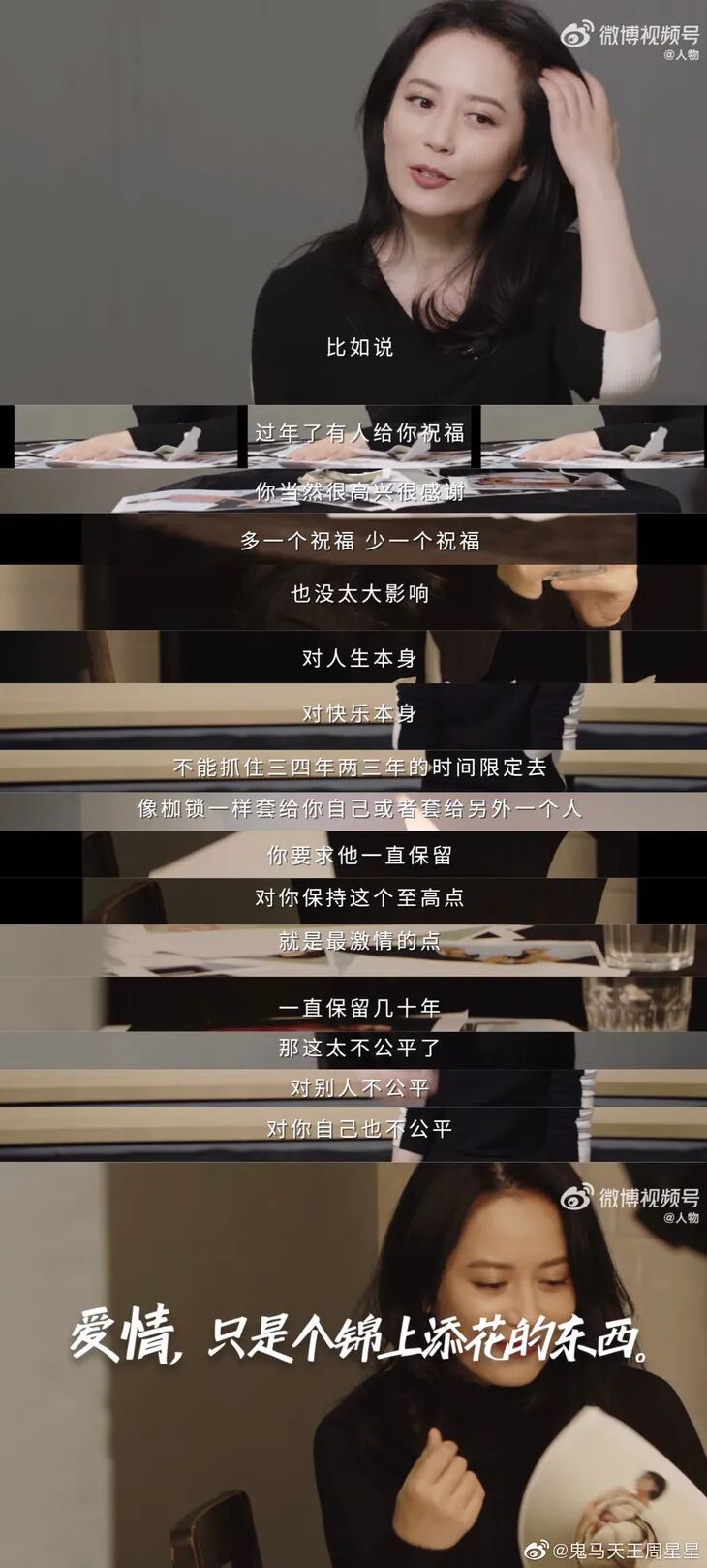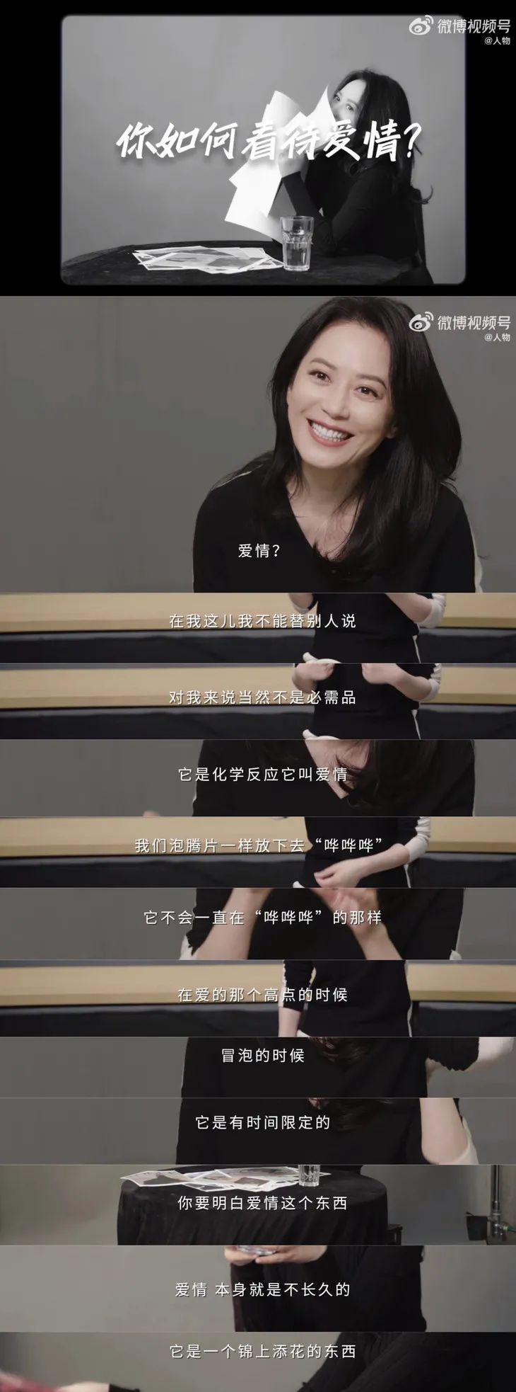 许多人喜欢探讨她的感情生活,追问她的感情状况,对此俞飞鸿大大方方地表达着自己的观念,同时也抚慰了许多人的内心。