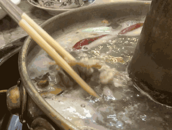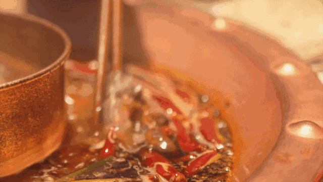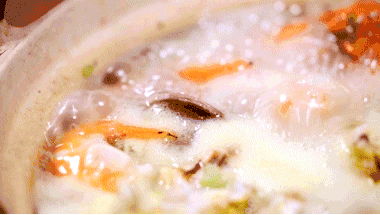 3. 等到粥滚开,粥水一层层从里面往外翻时,将从花心处滚起的粥水舀上来做火锅汤底就可以了。