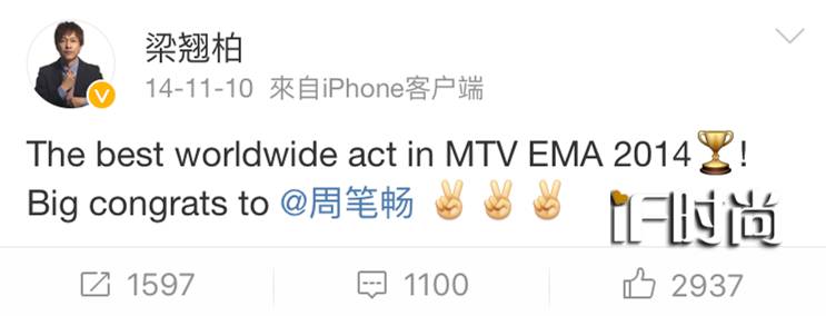 ▲2014年,笔笔去英国抱得EMA全球最佳艺人大奖,梁老师第一时间祝贺。