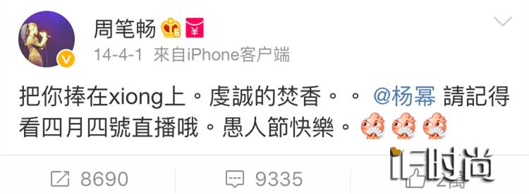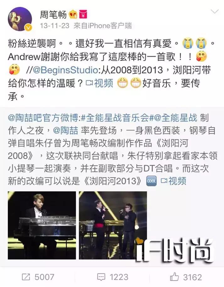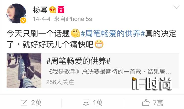 ▲去年,笔笔参加《我是歌手》的时候两人玩儿的更high,作为群众间呼声最高的一首歌曲,大幂幂还亲自发起了“周笔畅爱的供养”这个话题。