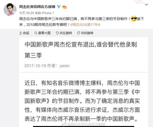 周杰伦资讯网官方微博发布消息称周杰伦与《中国新歌声》三年合约期已满,将不再参与《新歌声》的录制。