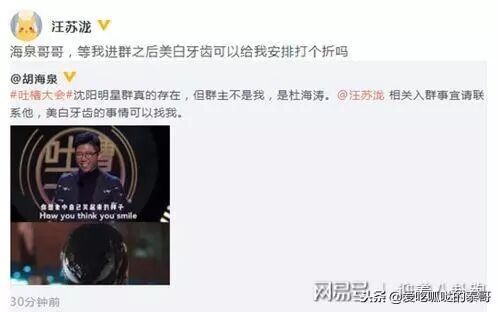随后,汪苏泷也转发微博并表示:“海泉哥哥,等我进群之后美白牙齿可以给我安排打个折吗?”