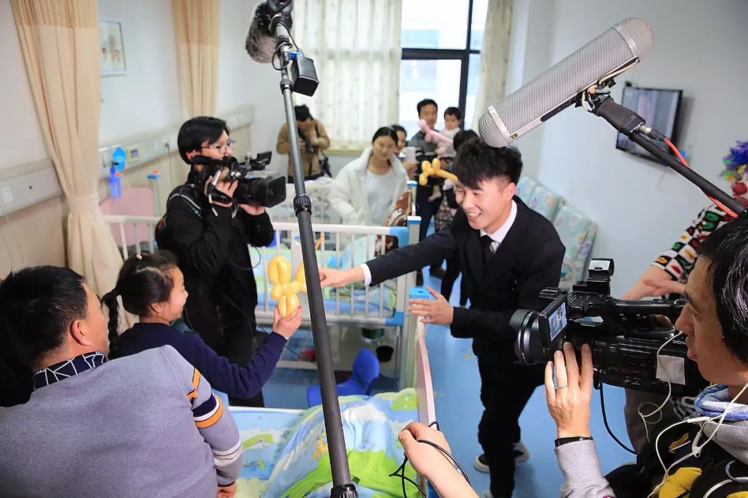 魔术哥哥在病床前,给华华表演魔术,孩子高兴极了,露出纯真的笑容。