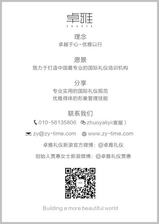 说明:文章为卓雅礼仪版权所有,谢绝任何形式的转载。卓雅礼仪可以提供专业培训、咨询、辅导服务。咨询电话:010-56135806 13811822650 客服微信:zhuoyaliyi ,课程详情请点击:【关于我们】卓雅礼仪提供的咨询服务和经典礼仪课程