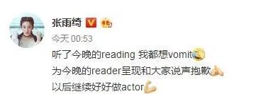 台词功底是每个演员的基本功,而科班出身的张雨绮,听完自己的原声都尴尬,赶忙发微博跟大伙道歉:以后不给大家朗读台词了。
