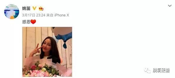 3月17日是姚笛37岁的生日,她也在社交网站上分享了一张生日照,并且配文:“感恩”。