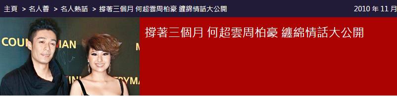 2010年两人同场出席活动,媒体报道俩人私下已经交往三个月,但因周柏豪处于事业上升期,也多次声明自己的私生活不想被打扰所以一直未公开。