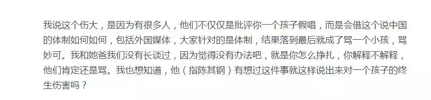 我曾经看过一篇《人物》采访林妙可母亲的文章,里面提到了假唱事件,还提到“所有的骂名,结果都是林妙可一个人在承担……大家针对的是体制,结果落到最后就成了骂一个小孩”。