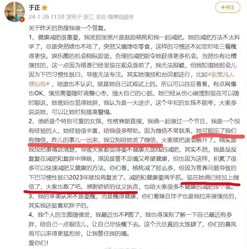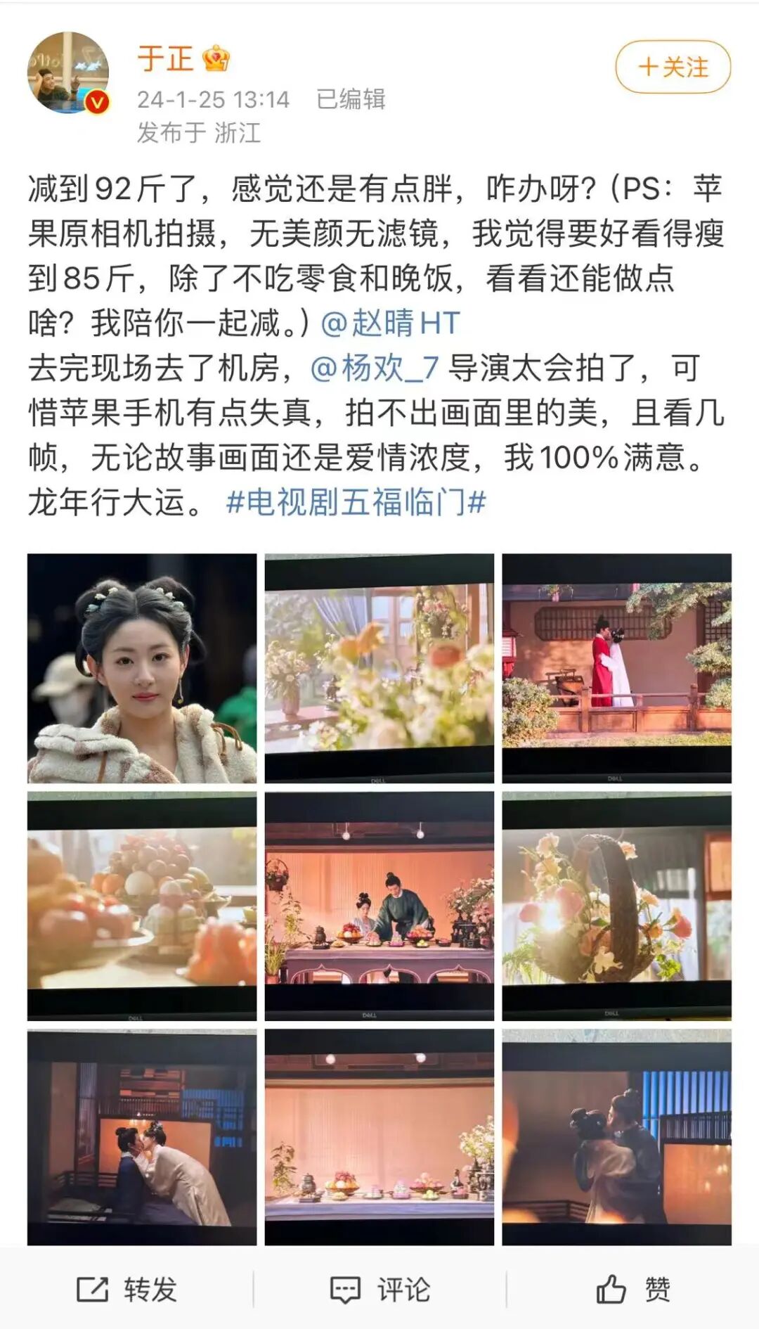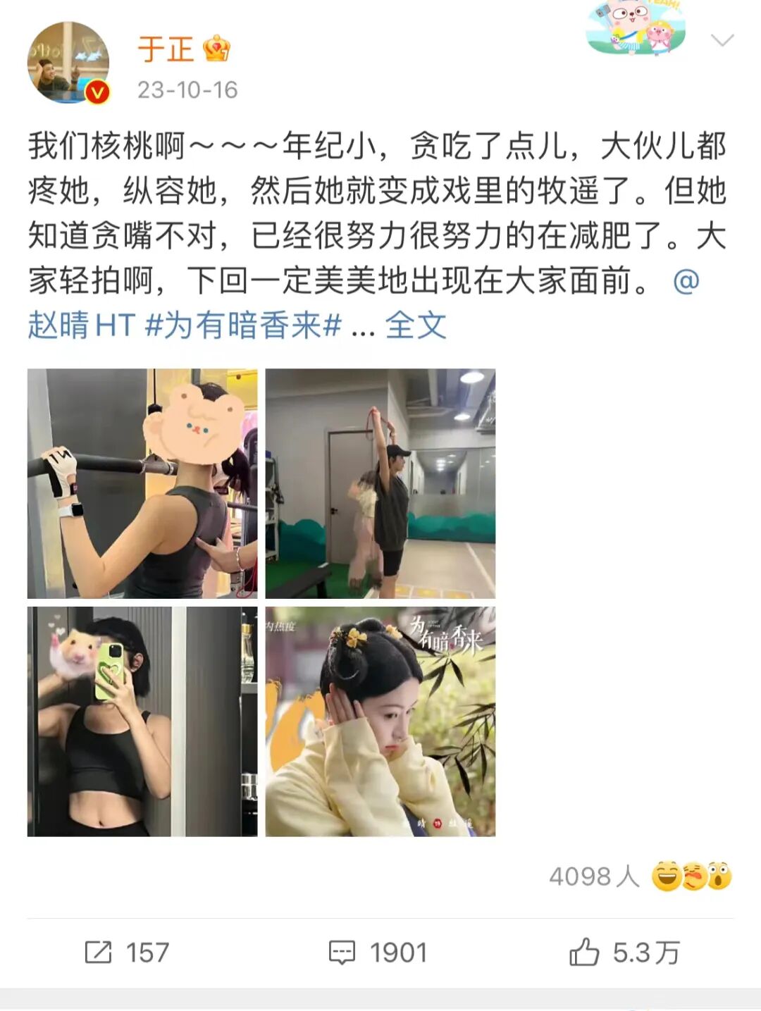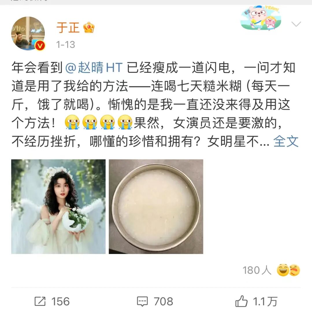 1月25日中午,于正发布了一条赵晴体重相关的微博,认为她92斤上镜依然有些胖,要是能瘦到85斤最好,为了鼓励演员减肥甚至提出了自己一起减肥的想法。