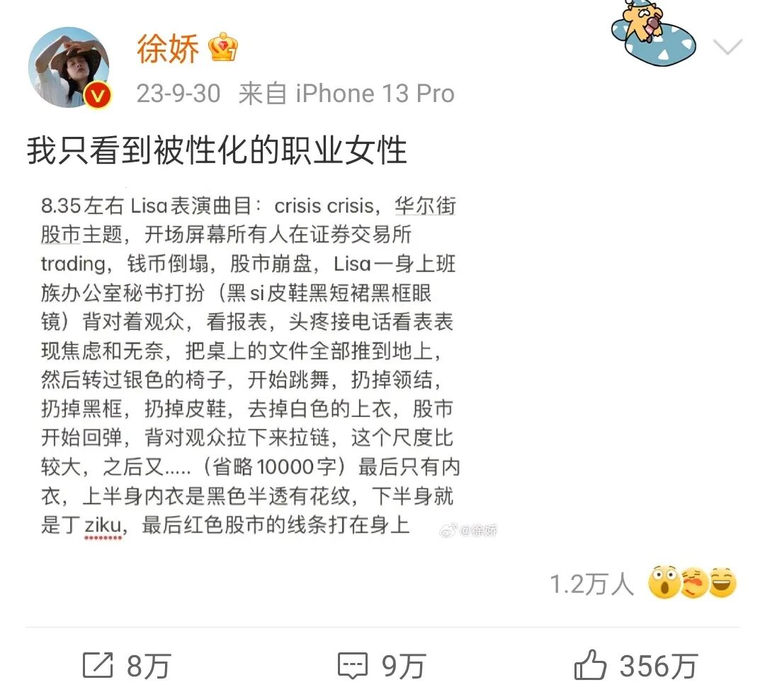 近年来,徐娇在互联网上的形象一直都是“敢做敢说”,虽然并没有特别大火的作品,但是一直在为女性发声。染粉头发、大方自信地发布自己的泳衣照、直言Lisa表演疯马秀带来的影响等等......