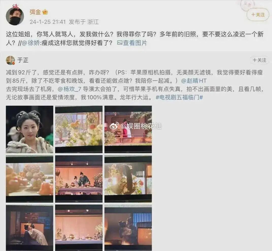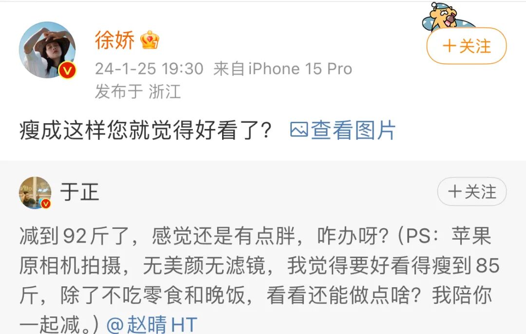 晚上看到如此发言的于正,徐娇直接附带一张于正公司的男艺人古装照转发开怼。除此之外,还在评论区发了她和赵晴的合照,直言“想要人瘦到85斤,简直是要人命”!