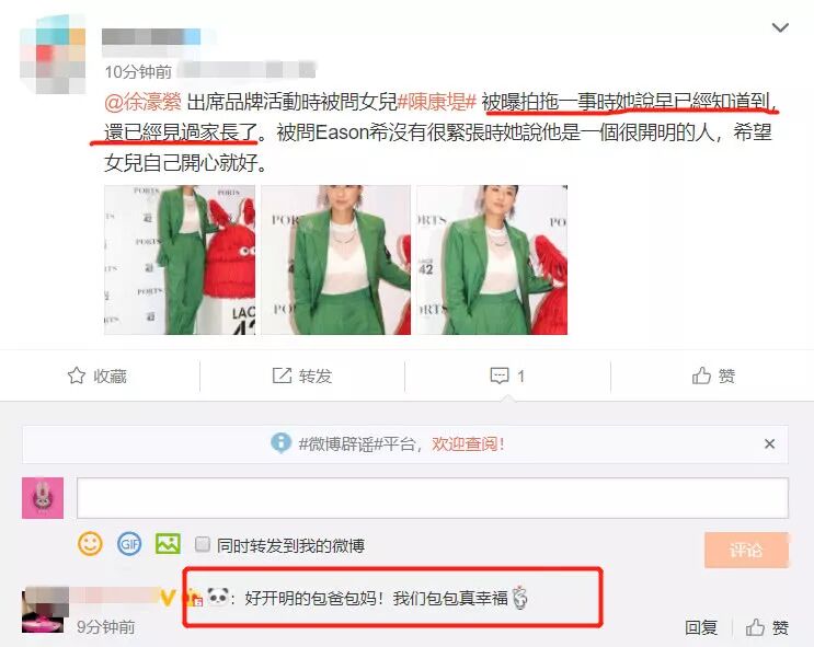 对于这对明星夫妻的态度,有网友感慨评论“好开明的包爸包妈!包包真幸福”。