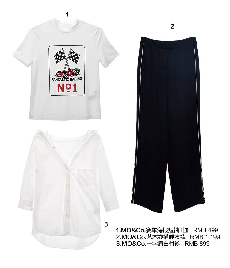 晨起,一件赛车元素白Tee搭配舒适的真丝睡裤,一身酷劲地唤醒早晨!自在居家感造型就这样生成了。