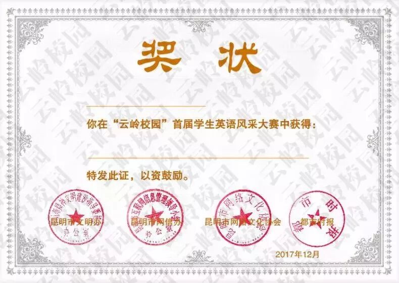 △ 大赛获奖证书样式【本次大赛的所有获奖证书,都将由昆明市文明办、昆明市网信办、昆明市网络文化协会及都市时报共同用印,以资鼓励。】