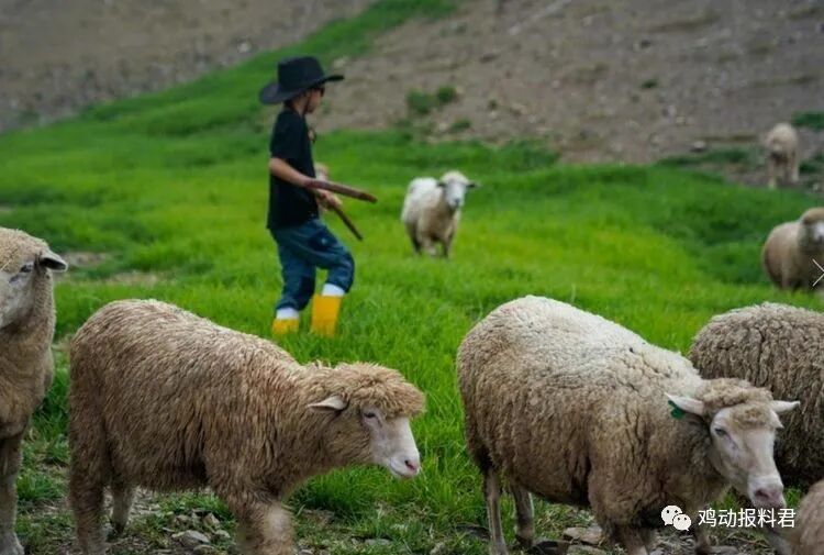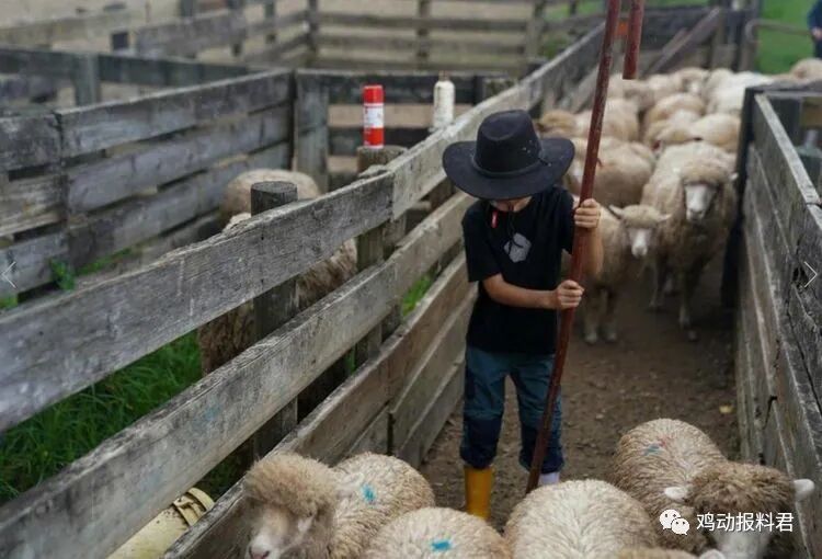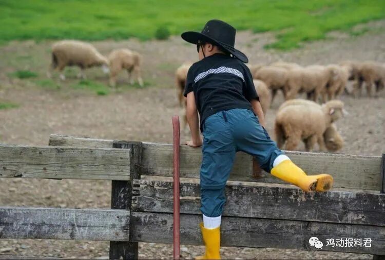 照片中,5岁的酷酷穿着黑色短袖、蓝色长裤、一双黄色雨靴和一顶黑色牛仔帽。看起来还真有点牧羊童的感觉。