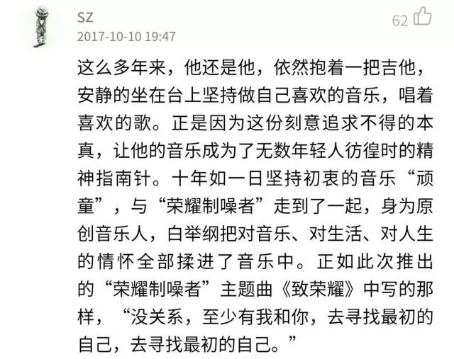 小白所唱的一字一句,不光像荣耀制噪者一样鼓励着在校大学生要勇敢追求音乐梦想,做出更多更好的原创音乐,还鼓舞着每一位年轻人“去寻找最初的自己”。