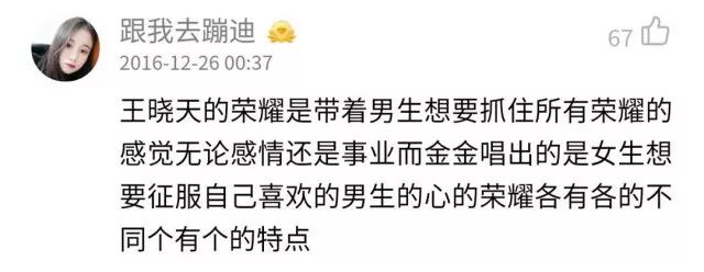 如果说王晓天版的《荣耀》是从郁郁不得志到坚守初心终见太阳,那余枫版的《荣耀》就是从刚刚完成的少年成长到勇敢的去拥抱世界。
