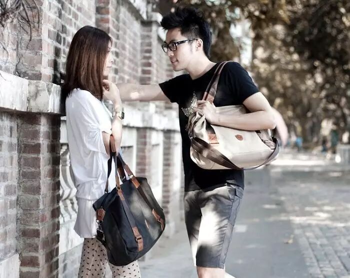 不用大块颜色,一个和他衬衫同色的包,就足够默契。▼