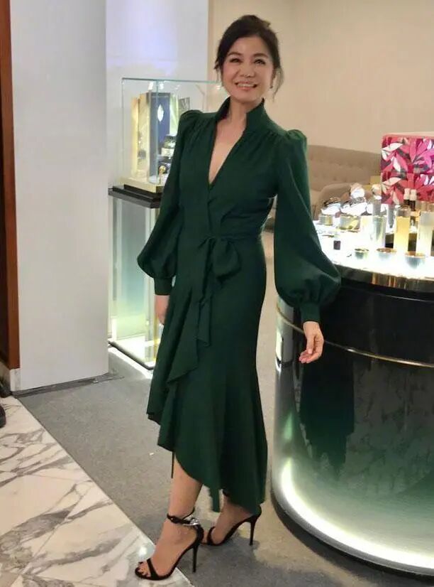 真想不到钟楚红穿的这一条绿色的裙子,上身效果居然这么好看,裙子穿在身上显得特别的瘦,而且还很性感,再加上裙子这个袖子做的特别的好,非常的显瘦。颜色上面看的话也显得特别的成熟很有张力。