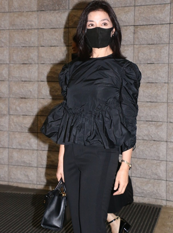 钟楚红上身穿的这一件黑色的衣服搭配黑色的裤子,整个人的穿搭风格还是非常的时髦。衣服的款式也是特别的简单,非常符合她本人的身材,不仅显高还显瘦,尤其是这一条黑色的裤子,穿在身上完全不会暴露她的腿型。