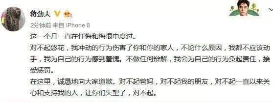 对不起悠花,我冲动的行为伤害了你和你的家人,不论什么原因,我都不应该动手,我为自己的行为感到羞愧,不做任何辨解,我会为自己的行为负起责任,接受惩罚。