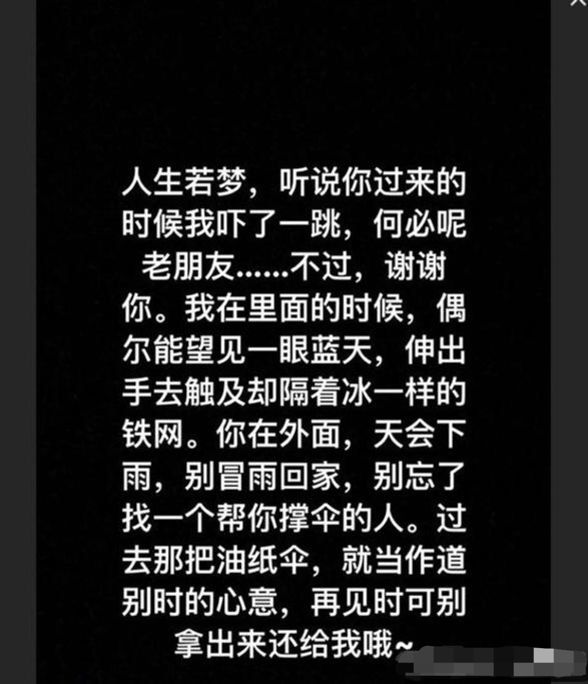 “人生若梦,听说你过来的时候我吓了一跳,何必呢老朋友……”