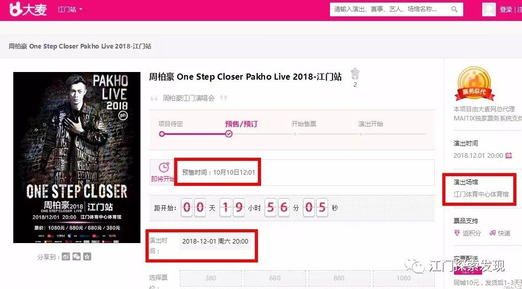 据了解,周柏豪江门站售票渠道已于今天9号上线。根据网站公示与周柏豪內地後援會官微指引,购票网址(大麦网):https://piao.damai.cn/164513.html ,公开预售日期时间:2018年10月10日12:01 AM。