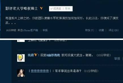 也是在那一年,影评人发了一个微博说某女星有水军吹嘘自己的演技,姚晨就在微博下评论说:我可没演《大武当》!直接把矛头扔给杨幂。