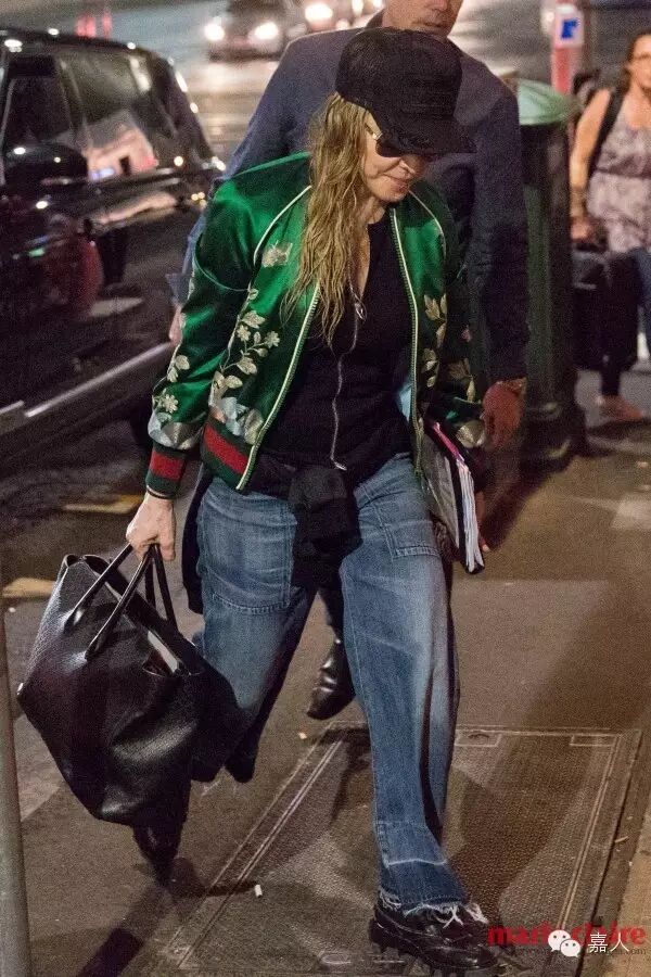 麦当娜的绿色刺绣夹克搭配宽松牛仔裤,大气随性。