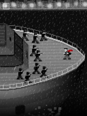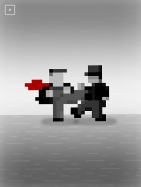 《大叔向前冲(UNCLE GO)》的画面采用像素风格制作,而且是那种模糊感最强的像素,看上去就是一团团的马赛克在蠕动…这么看来本作的画面也不怎么样嘛,其实不然,游戏的画质虽然十分模糊,但却运用了大量不同的镜头进行展示,什么近视角、远视角、大特写等各种镜头层出不穷,能为玩家带来一种电影式的视觉体验,在手游平台中很难见到这种独特的画面形式。此外,游戏中还有着大量的彩蛋元素,如果你能看懂的话就会觉得十分有趣,比如主角的红色披风(超人)、主角用出的天马流星拳(星矢)以及黑客帝国里的经典躲子弹动作(NEO)等等。最后兔子要说的是,如果你看腻了初始的黑白色调,还可以游戏开始前进行色调的更改,同有六种颜色可以选择哦。