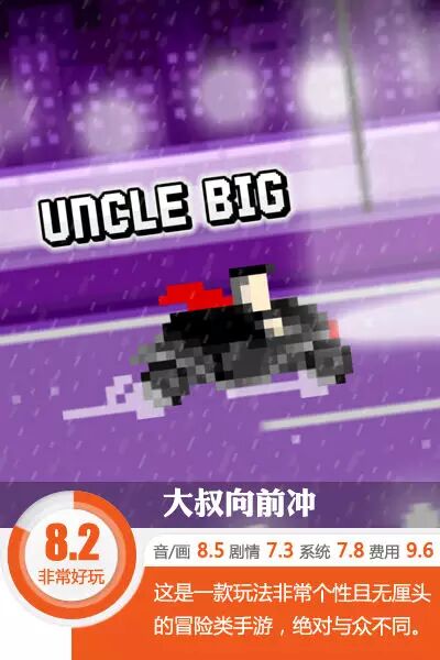 总的来说,《大叔向前冲(UNCLE GO)》是一款非常有个性的冒险类手游,游戏不论在画面、音乐还是玩法上都处处透着与众不同,使它在这个充满了抄袭和借鉴的游戏圈里显得那么另类,虽然还有着很多不足和需要改进的地方,但我就是喜欢它!11773评测室认为本作非常好玩。