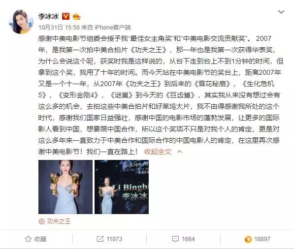 颁奖典礼后,李冰冰发微博称感谢中美电影节,并表示:她当年第一次获得华表奖时虽然从台下到台上不到一分钟,她却付出了10年努力。同时,从她第一次出演中美合拍片《功夫之王》到今天她再次获奖,又是一个11年才让她再次凭借合拍片《巨齿鲨》问鼎影后桂冠。