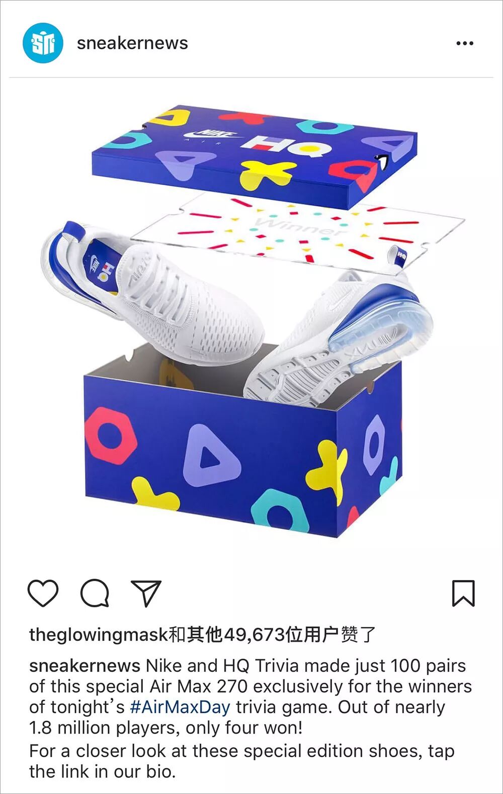 在一年一度的 Air Max Day 到来之际,Nike 自然准备了不少主题活动来庆祝一番,除了各种新推出的鞋款之外,还找到 HQ 来了个跨界合作,玩出了新的花样。HQ 作为一个直播答题类游戏,与国内大家熟悉的芝士超人玩法差不多,大概就是在主持人的带领下参与各种知识问题的答题,最终全部答对的玩家可以获得相应的奖励。而在这次的联名活动中,Nike 准备了高达 100000 美元的奖品,100 名优胜者还能获得一双限量 100 双的特别版本的 Air Max 270,不过想要在近 2 万名参与者中脱颖而出,可能得是个上知天文,下知地理的“学霸”才能做到了…