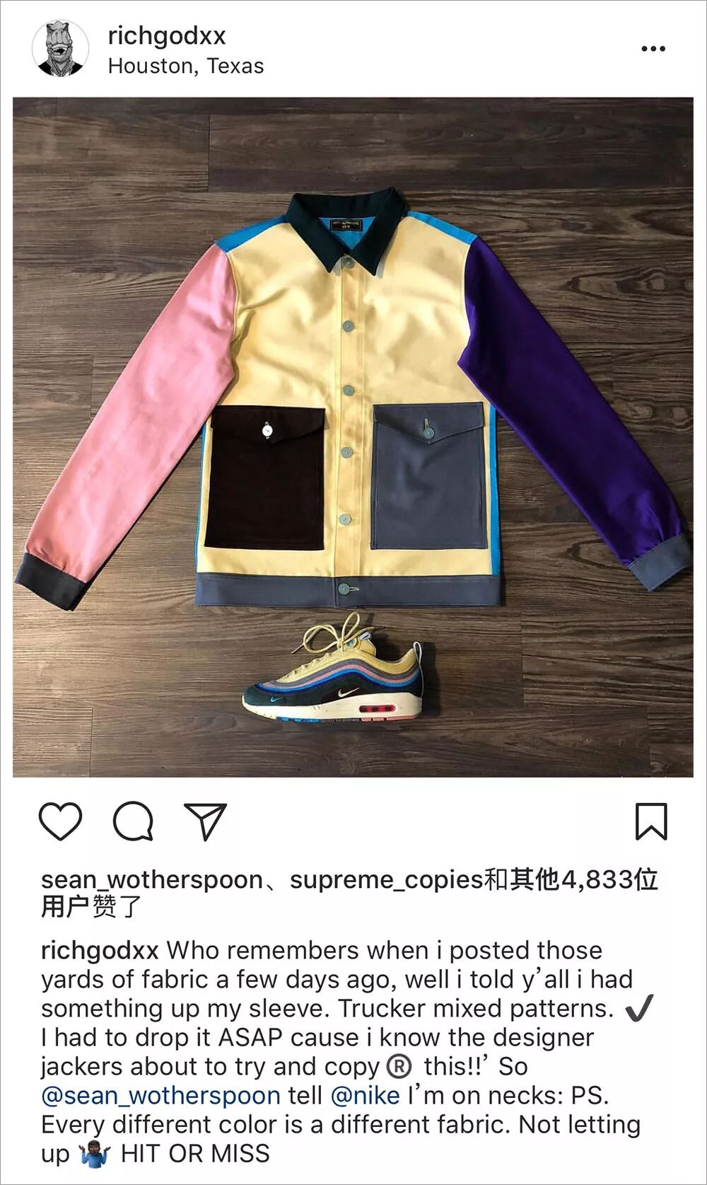 随着 Air Max 1/97 在国内地区的正式发售,大家对于这款鞋的热情也一同达到了顶峰,除了纷纷入手晒图之外,还有不少能人带来了关于这双鞋子的新奇创意,比如…图中的这件外套。这位名为 @richgodxx 的设计师,将 Air Max 1/97 上使用的颜色提取出来自己设计了一款周边外套,还将在最近限量发售。另外值得一提的是,据说每款使用的颜色都不相同,只有购买者在拿到实物后才能看到属于自己的那件到底是什么样子…不过仅仅限量 5 件的情况,想要购买可能需要你多花点心思了…