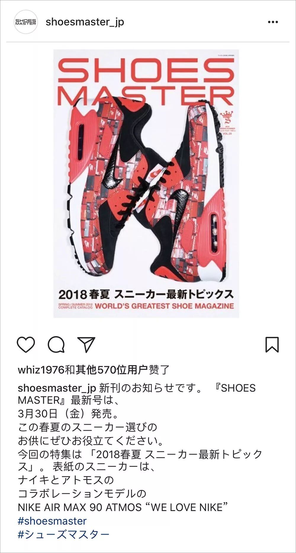 本以为最近的众多新鞋款已经足以让 Sneakerhead 们好好满足一下购买欲了,但今天球鞋杂志 《SHOES MASTER》 又无预警地为我们带来了一个新的惊喜。正如最新刊杂志封面中所展示的,这是一双名为 “We Love Nike” 的 Air Max 90 新设计,其将 Nike 以往的经典鞋盒呈现在了鞋身之上,对于“老鞋头”们一定有着不小的吸引力,而至于何时发售,继续关注我们就能知道了。