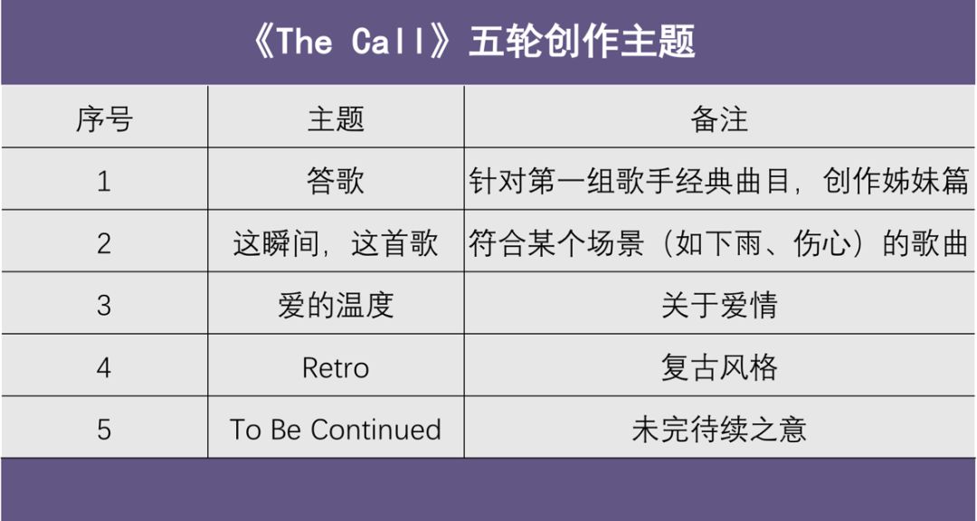 每轮配对后歌手们会进行为期两周的、限定主题的音乐创作。主题限定如下图所示: