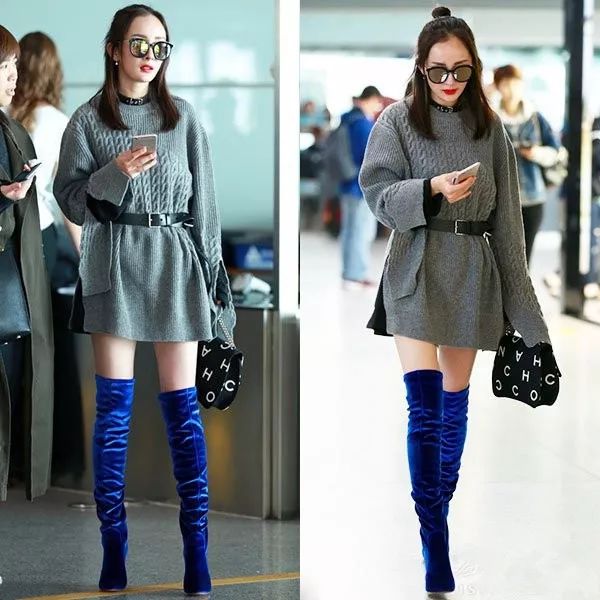 搭配嬉皮风格的宝蓝色丝绒长靴