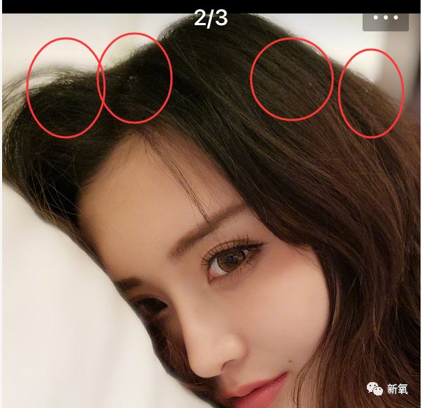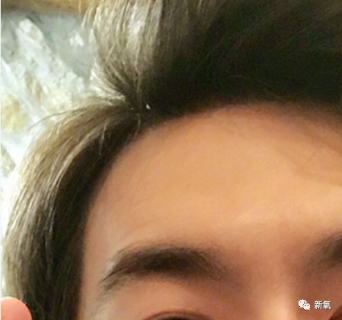 另一侧的照片不仅分区线一样醒目,发际线边缘还更稀疏了。一时之间不知道是发型师还是摄影师的锅。