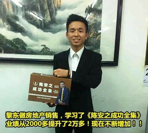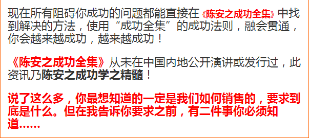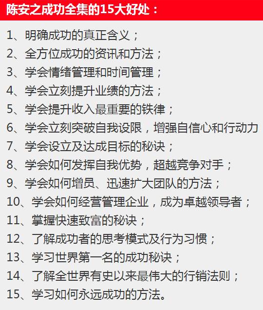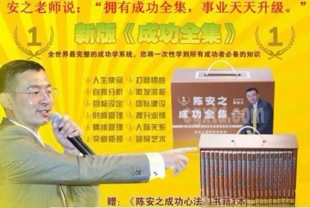 不管你现在遇到各种的问题与挑战,今天你遇到了陈安之老师,你现在所有的问题都已经不在是问题,因为陈安之为你分享自己是怎样快速成功致富的方法,让你在最短的时间内提升你的个人的能力和收入,不管你现在在社会的任何层次,这套产品可以让你越来越成功、越来越成功。那就是:这套《陈安之成功全集》。