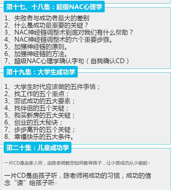 陈安之成功全集这套产品浓缩100多位世界第一名的成功经验,汇集陈安之老师20年成功精华,你的成功人生必读物,这不只是一套产品,这更是一部成功哲学,这不是一个能以金钱来衡量的物品,这将是你一生的传家之宝!