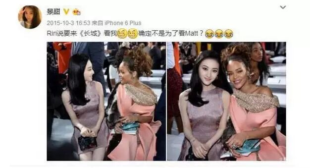 2015年,景甜与张艺谋合作好莱坞魔幻电影《长城》,对于基本不用熟脸女星的张艺谋牵手景甜也是一个奇迹。看海报就知道景甜是唯一一个女性!一众配戏的大咖更是无限升级,连张涵予、鹿晗、林更新、彭于晏都只有打酱油的份了。